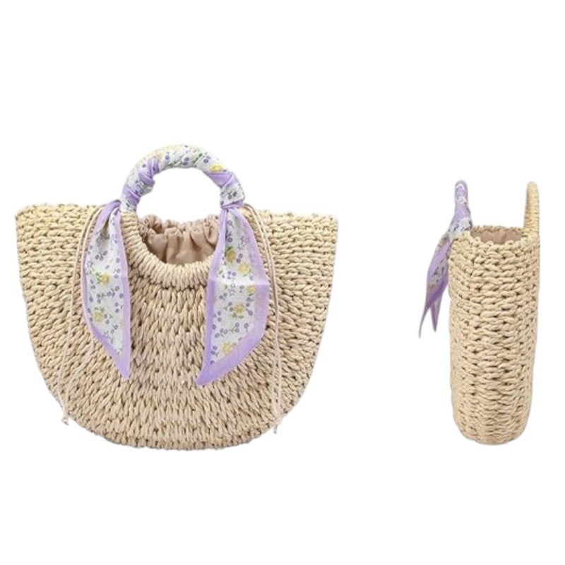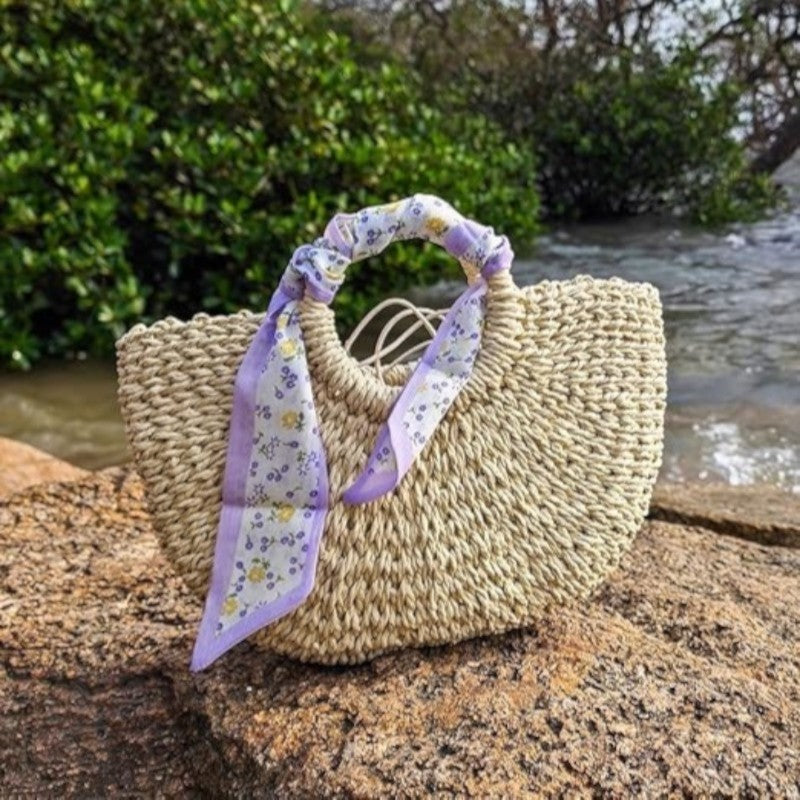 Design: Premium straw bag for women with removable silk scarf and shell accents, handcrafted boho-chic style, perfect for beach days.